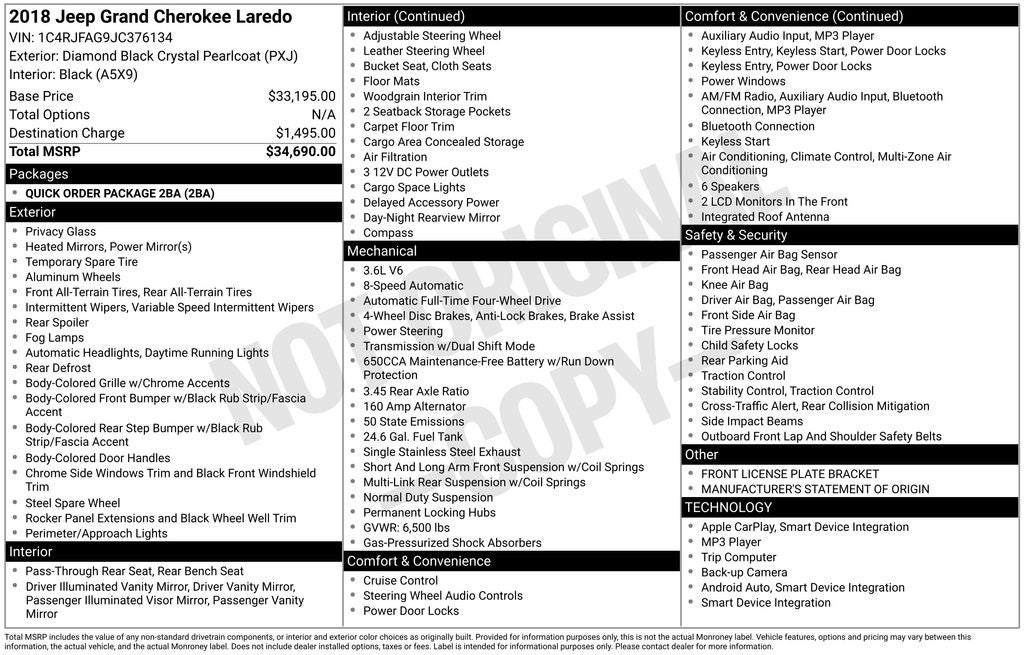 This 2018 Jeep Grand Cherokee Laredo is a true standout in its class. With its powerful 3.6L V6 engine, 4-wheel drive capability, and impressive fuel efficiency, it's the perfect blend of capability and efficiency. The sleek black exterior and well-appointed interior make this Grand Cherokee a head-turner wherever you go.