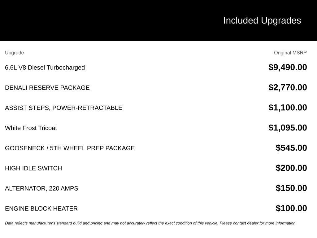 The Denali Reserve Package adds even more luxury, with the Technology Package and a power sunroof. For towing and hauling, the Gooseneck/5th Wheel Prep Package and Heavy Duty Front Spring/Camper Package provide the necessary capabilities. With 220 amps of alternator power, an engine block heater, and a high idle switch, this Sierra is built to handle the toughest tasks.